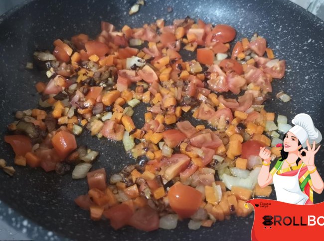 Затем добавила нарезанный средними кубиками помидор. Жарю еще минутку.