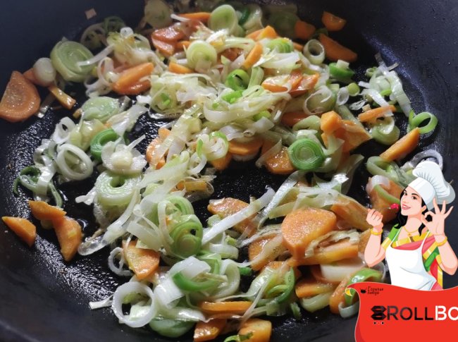 На сковородку растительное масло, нарезанный кольцами лук порей (не забудьте хорошо промыть), морковь кольцами. Обжариваем слегка.