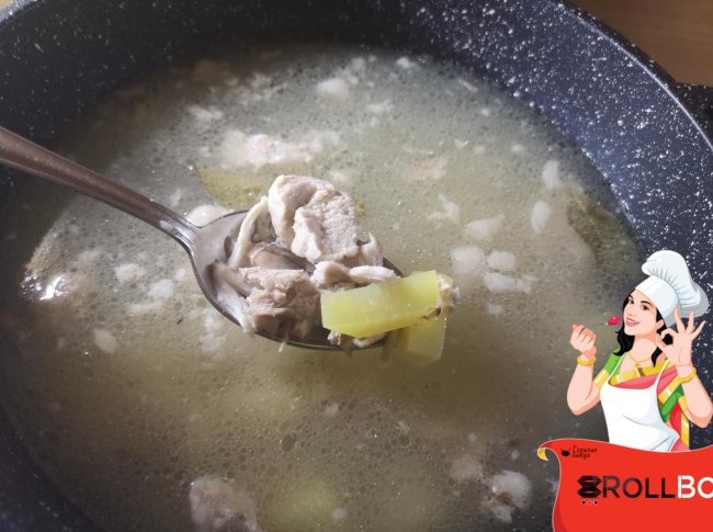 В готовый бульон с мясом кидаем картофель, пару лавровых листиков и солим.