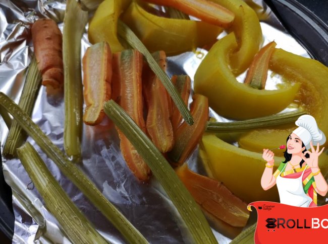 Тыкву, морковь и сельдерей режем произвольно крупно и запекаем в духовке до готовности.
