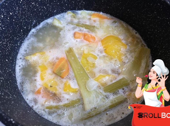 Печеные овощи перекладываем в кастрюлю, добавляем воды, апельсиновый фреш и ставим вариться 5 минут.