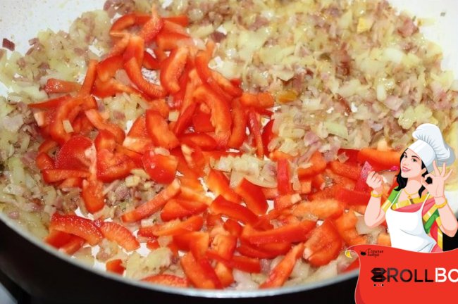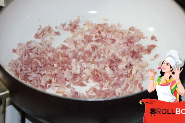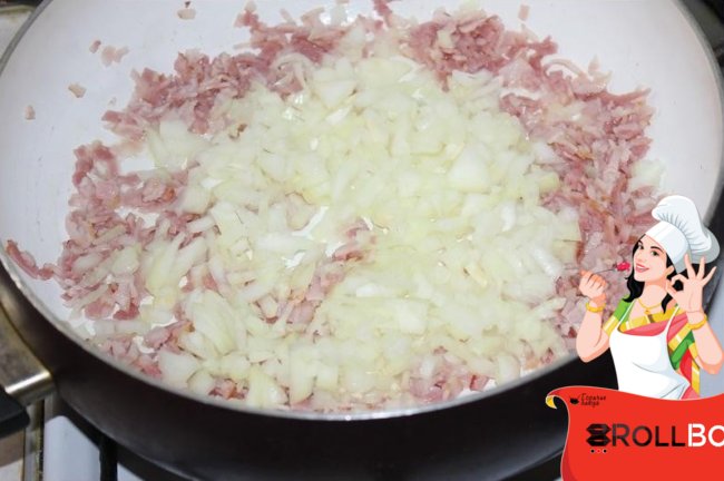 Жарить бекон примерно 2~3 минуты.У меня в беконе жира было очень мало,поэтому я добавила чуть-чуть растительного рафинированного маслица.Пока жарится бекон, нарезать лук как можно мельче.Выложить его к бекону.