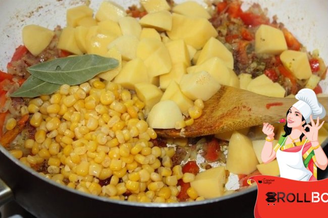 Жарить 2~3 минуты.Картофель вынуть из воды и положить к овощам.Жарить при периодическом помешивании 5 минут.Добавить в сотейник консервированную кукурузу, перец,любимые специи ,лавровые листики и соль (количество соли зависит от солёности бекона).