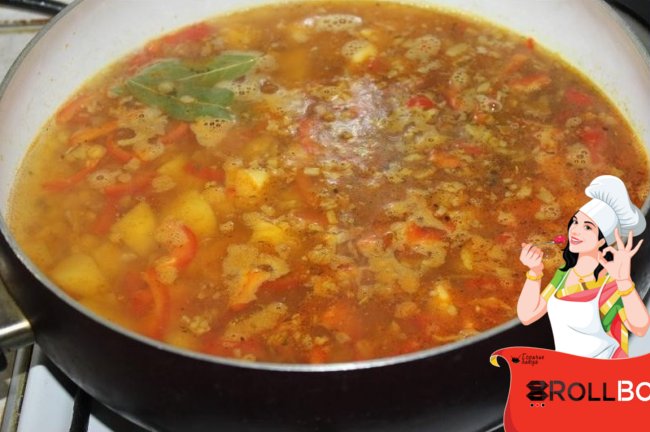 Отличительной особенностью супа является то, что он готовится не в кастрюле, а в глубокой сковороде.