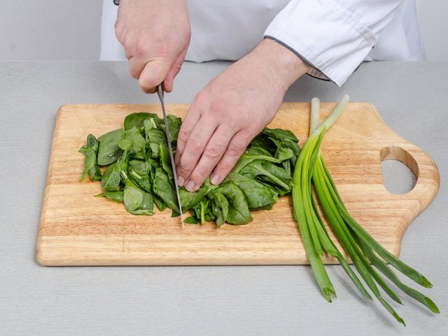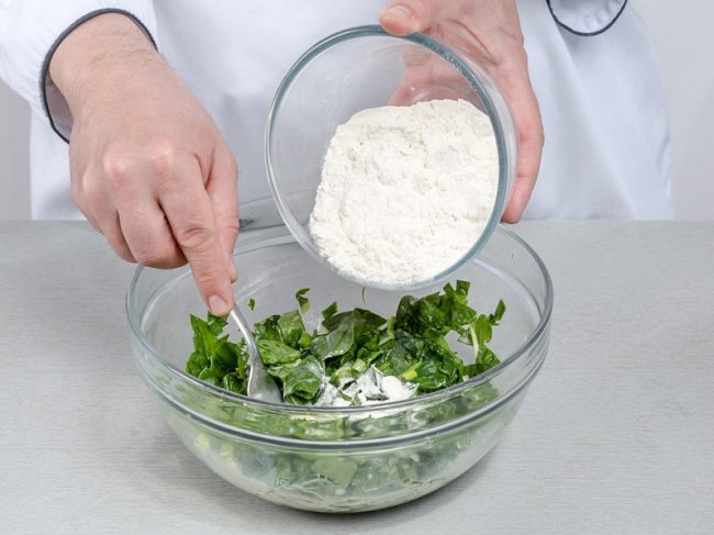 Отжать листья в дуршлаге, переложить на доску, промокнуть бумажным полотенцем. Нарезать. Зеленый лук и петрушку измельчить. Муку смешать с разрыхлителем.