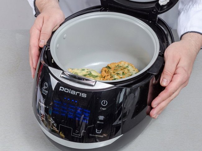Выложить ложкой 2-3 небольшие оладушки и обжаривать их с обеих сторон до румяной корочки 10 мин. по 5 мин. с каждой стороны. Таким же образом обжарить остальные оладушки. Перед каждой новой порцией доливать в чашу мультиварки растительное масло. Оладушки подавать горячими с мацони.