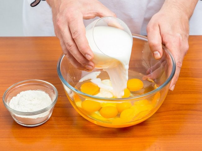В миске взбить яйца с солью, перцем, молоком и мукой до однородности.
