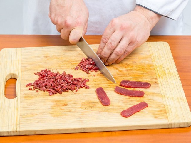 Бастурму очистить от корочки, мелко нарезать и добавить к яичной смеси. Перемешать.