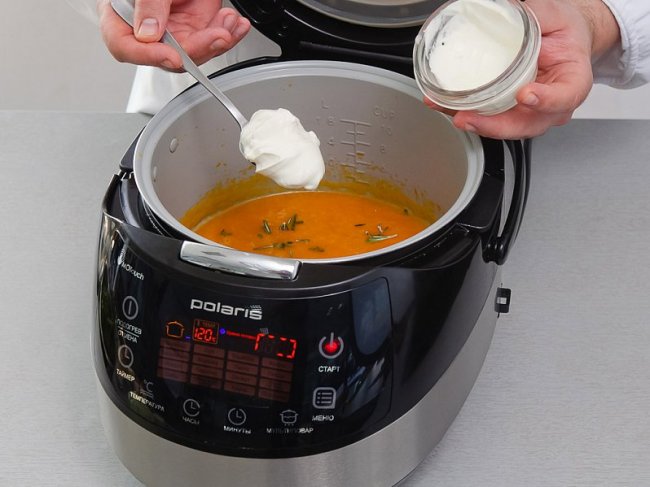 В блендере измельчить мякоть тыквы в пюре. Вернуть его в чашу, добавить бульон, розмарин, тимьян, сметану, соль и сахар. Готовить в режиме «Мой рецепт plus (мультиповар)» при температуре 140° С 5 минут.