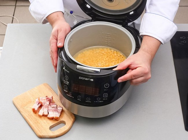Горох промыть и замочить на 2 часа. Отбросить на дуршлаг, выложить в кастрюлю мультиварки, влить свежую воду так, чтобы она только покрывала горох. Варить в режиме «Мой рецепт plus (мультиповар)» 2 часа при температуре 90°С. За 30 минут до готовности добавить грудинку, нарезанную на кубики.