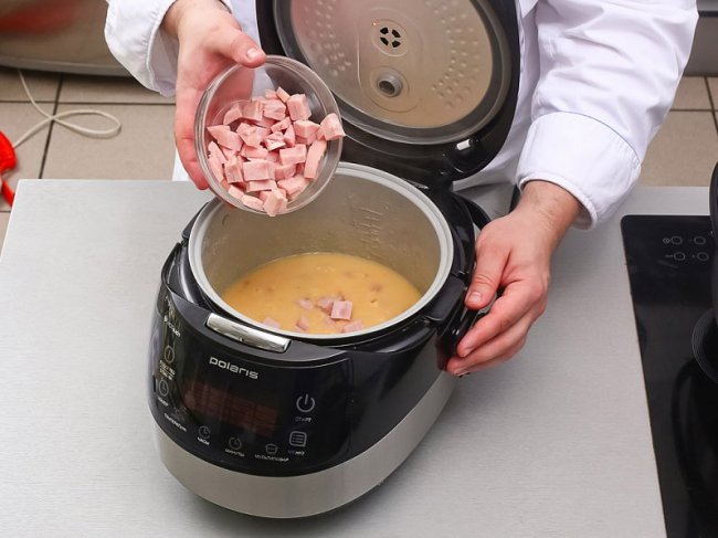 Ветчину нарезать небольшими кусочками. Добавить в кашу и поставить на режим «Подогрев» на 5 минут.