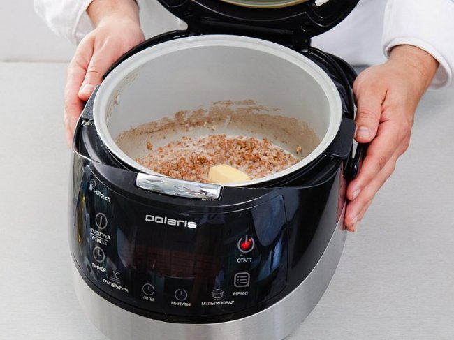 Установить режим «Крупа» и готовить 25 минут. В готовую кашу добавить сливочное масло, перемешать и подать к столу.