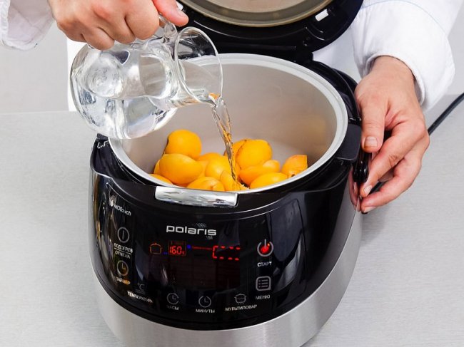 Абрикосы тщательно вымыть, разрезать пополам и удалить косточки. Включить режим «Мой рецепт plus (мультиповар)», установить температуру 160 °C, в чашу сложить половинки абрикосов, влить воду и готовить 20 минут.
