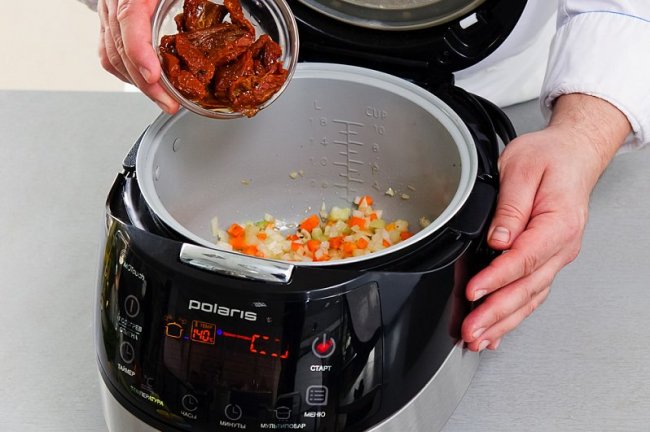 Очистить и мелко нарезать лук, морковь, чеснок и сельдерей. Разогреть в чаше мультиварки масло и в режиме «Мой рецепт plus (мультиповар)», установив температуру 140° С, обжарить, помешивая, все овощи, 10 минут. Добавить смесь итальянских трав и вяленые помидоры, перемешать.