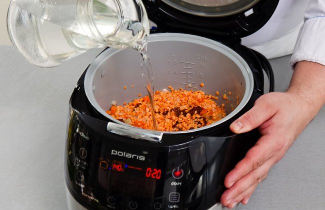 Всыпать промытую чечевицу, влить 4 стакана воды. Закрыть крышку и готовить в том же режиме 30 мин.
