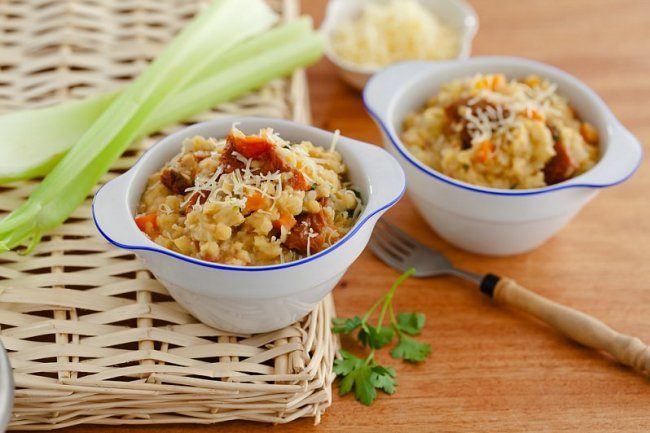 Рецепт: Чечевица с вялеными помидорами в мультиварке Ингредиенты 1 стакан розовой чечевицы 100 г консервированных вяленых помидоров 1 луковица 2 морковки 2 черешка сельдерея 3 зубчика чеснока 3 веточки петрушки 3 ст. л. тертого пармезана 2 ст. л. оливкового масла 2 ч. л. смеси сухих итальянских