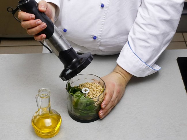 Приготовить соус песто. Измельчить базилик, чеснок и орехи в блендере. Приправить солью. Продолжая взбивать вливать оливковое масло тонкой струйкой.