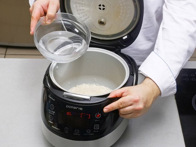 В кастрюлю мультиварки всыпать промытый рис, влить 2 стакана горячей подсоленной воды, готовить в режиме «Мой рецепт plus (мультиповар)» 20 минут при температуре 100° С.
