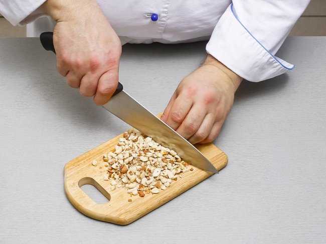 Орехи крупно порубить и добавить в рис, перемешать и выложить на блюдо.