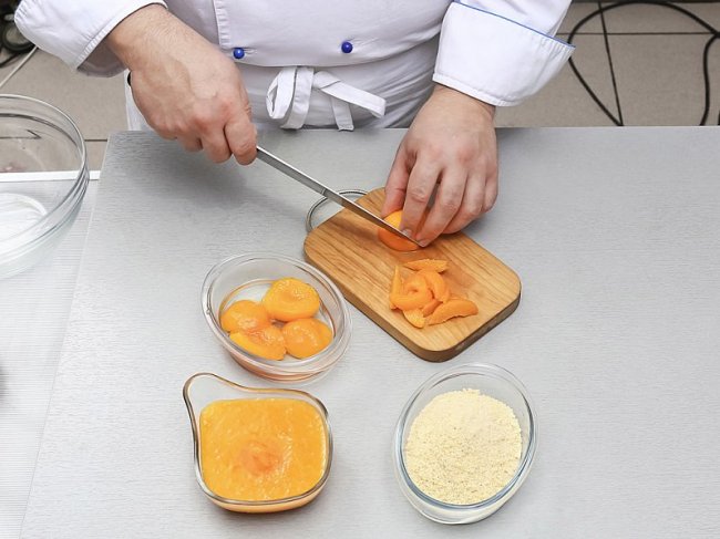 Миндаль измельчить в муку. Абрикосы вымыть, разрезать пополам, удалить косточки. Половину абрикосов измельчить с сахаром в блендере. Оставшиеся плоды нарезать тонкими дольками.