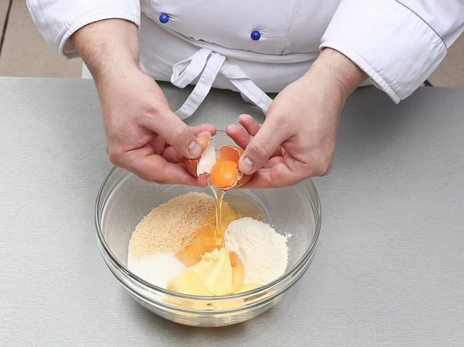 Добавить в измельченный миндаль муку, сахар, сливочное масло и яйца. Вымесить тесто.