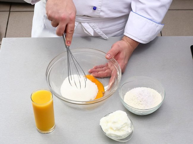 Отделить белки от желтков. Белки взбить в крепкую пену. Желтки растереть с сахаром. Муку просеять с разрыхлителем в миску с желтками. Постепенно, все время перемешивая, влить половину апельсинового сока. Ввести в тесто взбитые белки и аккуратно перемешать.