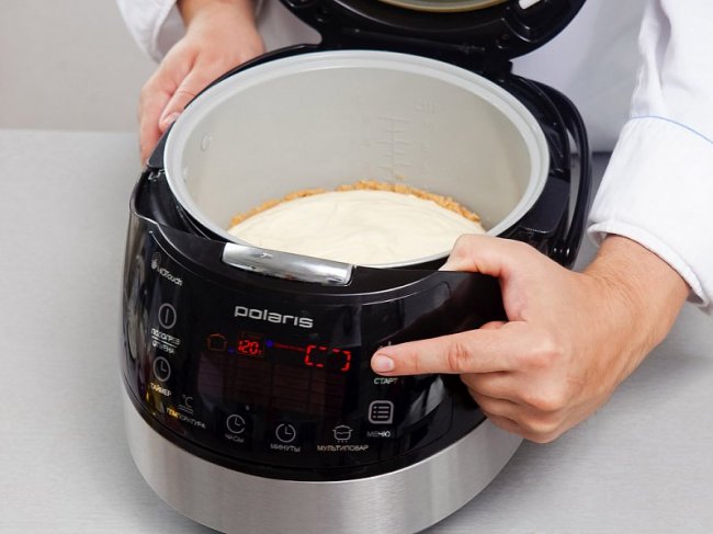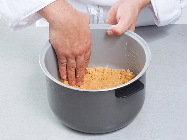 Печенье измельчить в блендере вместе с маслом в однородную массу. Выложить получившуюся массу на дно и по бокам чаши мультиварки, утрамбовать руками и поставить в холодильник на 30 мин.
