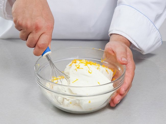 Взбить венчиком или миксером творог с апельсиновой цедрой и сахаром. Продолжая взбивать, добавить по одному яйца.