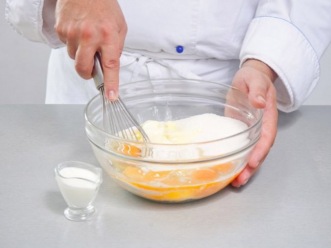 Муку, разрыхлитель, яйца, масло и сахар взбить до получения однородного теста.