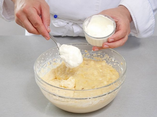 Бананы очистить и размять в пюре, добавить его в тесто вместе со сметаной. Тщательно перемешать.