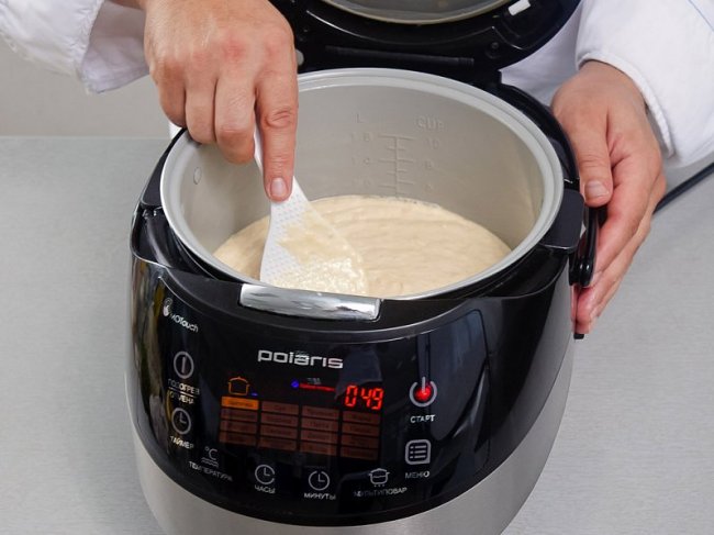 Включить режим «Выпечка», чашу мультиварки смазать маслом и переложить в нее тесто. Разровнять поверхность и готовить 1 час 25 мин.
