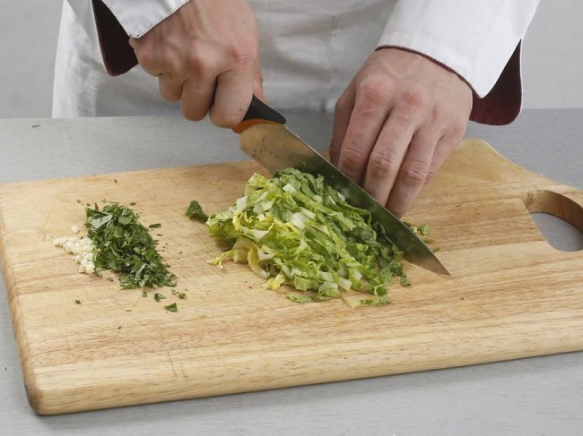 Включить режим «Мой рецепт plus (мультиповар)», установить температуру 160°С, разогреть 2 ст. л. оливкового масла и обжарить куриное филе, несколько раз перевернув, 15 мин. Дать остыть, затем нарезать кубиками. Чеснок очистить и измельчить, петрушку вымыть, обсушить и мелко нарезать. Салат романо разобрать на листья, вымыть, обсушить и нарезать очень тонкой соломкой.