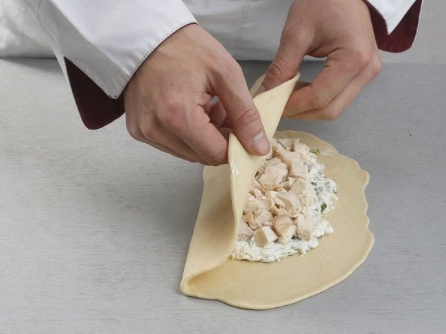 Раскатать тесто в тонкий круг. Выложить на одну половину приготовленную начинку, отступив от края 1,5 см. Сверху разложить кусочки курицы. Смазать свободные края оставшимся белком.
