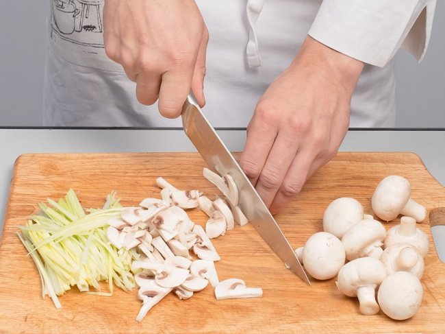 Добавить лук-порей, нарезанные ломтиками шампиньоны и чеснок, через 5 минут – зелень тимьяна и укропа, готовить еще 2–3 минуты.