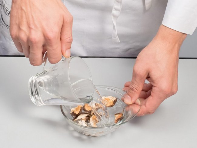 Сушеные грибы разломать на кусочки и замочить в горячей воде. Чеснок очистить и порубить.