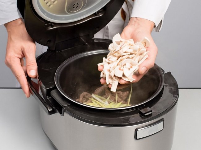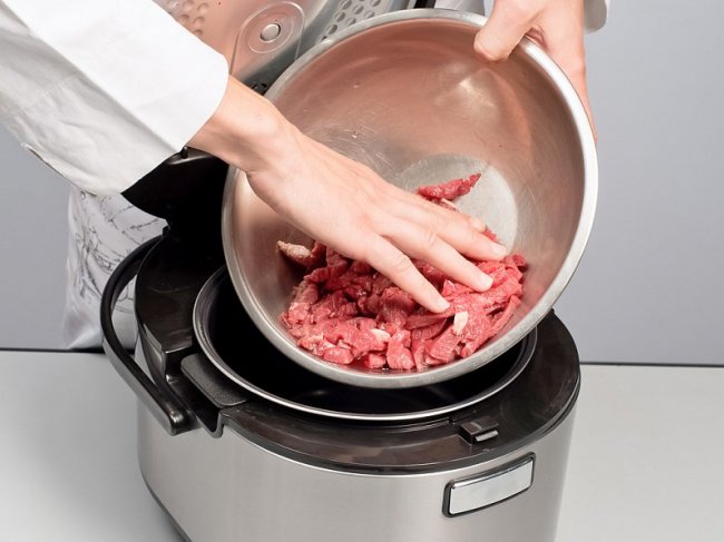Вырезку обжарить на оливковом масле в чаше мультиварки в режиме «Мой рецепт plus (мультиповар)» при 160 °С, 5–7 минут.