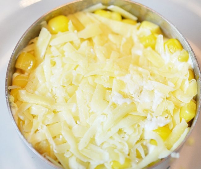 - Завершить выкладку салата кукурузой и майонезом.
