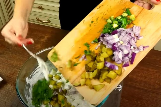 - Филе сельди нарезать кубиком и смешать со сметаной.