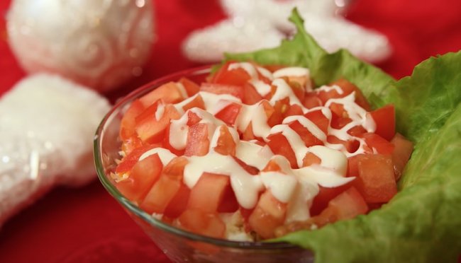 - В самом конце выложить помидоры и снова покрыть соусом. После этого салат можно подавать к столу.