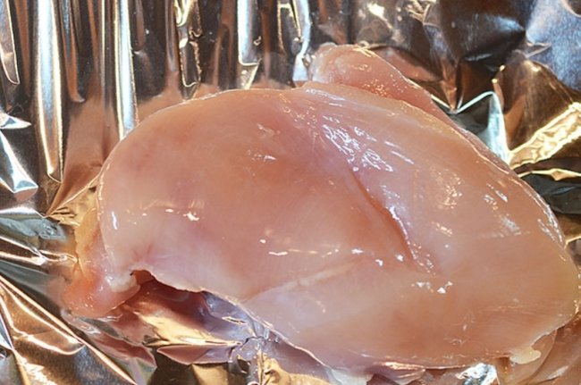 - Посолить куриную грудку и обернуть ее фольгой. Выпекать до готовности, после чего дать остыть.