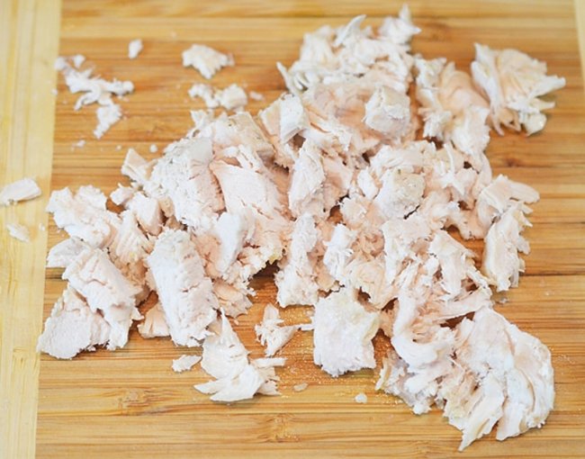 - Куриное мясо сварить в соленой воде на протяжении получаса после закипания воды. Извлечь его и подождать полного остывания. Нарубить кубиком.