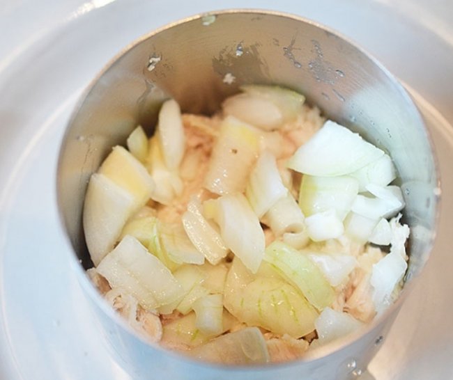 - Выложить курицу в сервировочное кольцо и промазать майонезом.