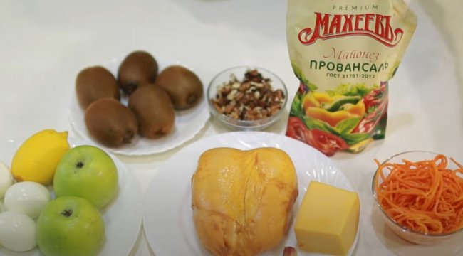 В салат можно добавить сладкую кукурузу или киви, а вместо орешков для украшения использовать оливки или маслины.