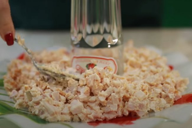 - На блюдо для подачи салата по центру ставим стакан, чтобы в итоге получился браслет. И теперь вокруг стеклянного сосуда распределяем копченое мясо. Нижний слой сразу хорошо выравниваем и утрамбовываем.