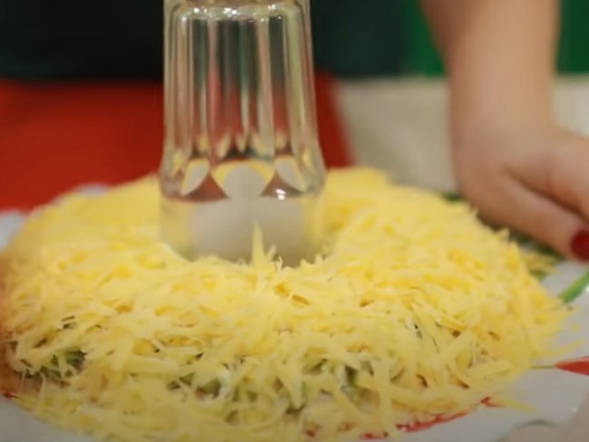- Будем делать салат в виде венка, поэтому на широкое блюдо ставим форму, а в центр — небольшой стакан и начинаем готовить. Первым слоем идет тертый картофель, который покрываем сеточкой из майонеза.