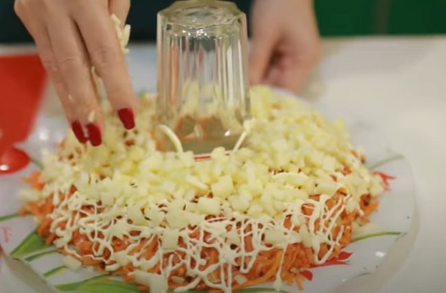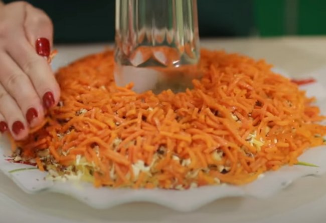 - Следующий слой – морковь по-корейски, ее нарезаем более мелкими кусочками, слой уплотняем, чтобы салат не развалился, и снова наносим тонкую сеточку из майонеза.