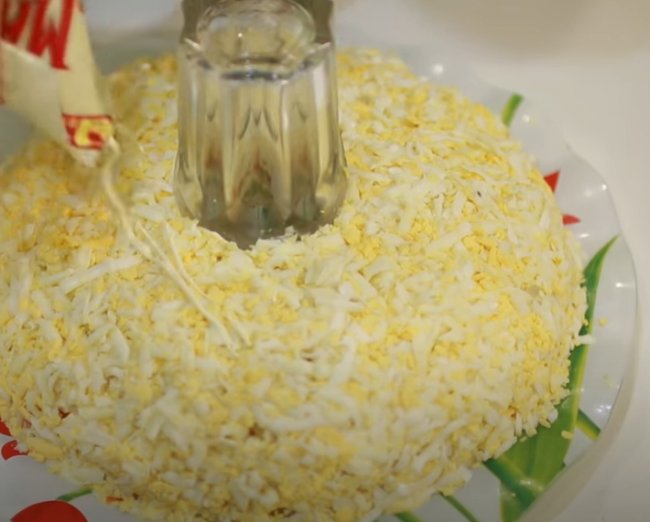 - Завершаем сборку вареными яйцами, натираем на терке и засыпаем со всех сторон.