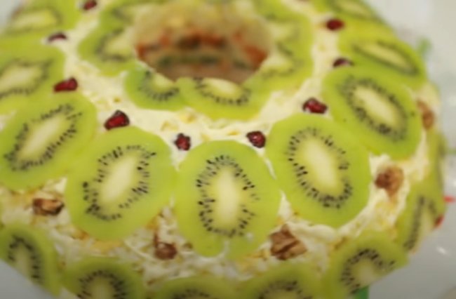 - Слой из яиц слегка приминаем, наносим тонкий слой майонеза, украшаем салат тонкими кружочками киви, грецкими орешками и зернами граната.
