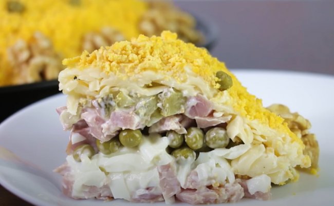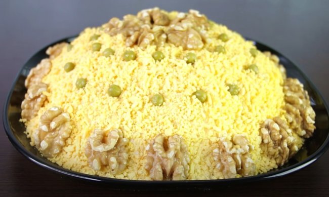 - Теперь присыпаем сверху тертыми желтками. Украшаем салат зеленым горошком и грецкими орешками.