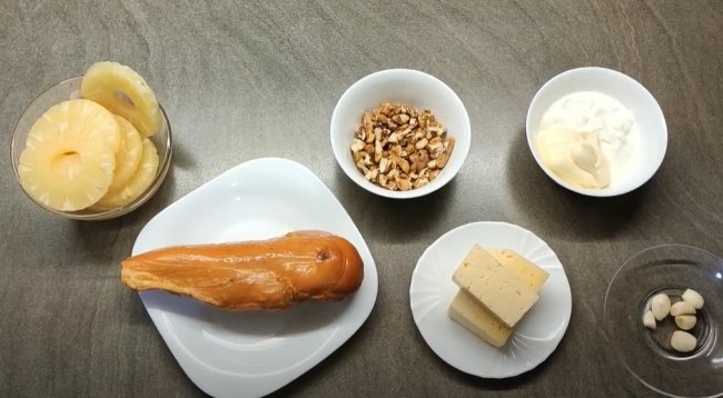 Копченую курицу можно заменить отварной, но копченость придает салату более яркий и насыщенный вкус.